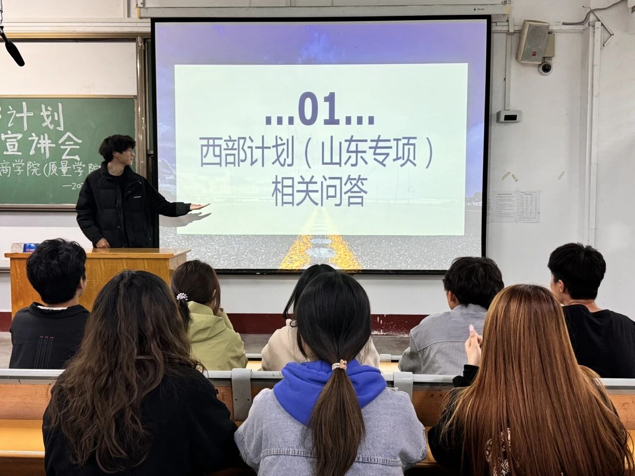 此次宣讲会以线上线下融合的方式有序开展,活动负责人刘晓畅首先带领同学们观看了聊城大学西部计划工作纪实视频和招募宣传片,从服务内容、优惠政策到发展前景全方位解读西部计划,有效激发了同学们的参与热情。孙意祥、侯旭涵借助线上直播平台,深入阐述了西部计划的“聊大现象”,并针对专项补贴、生活补助、休假制度等保障措施进行了细致解读。
