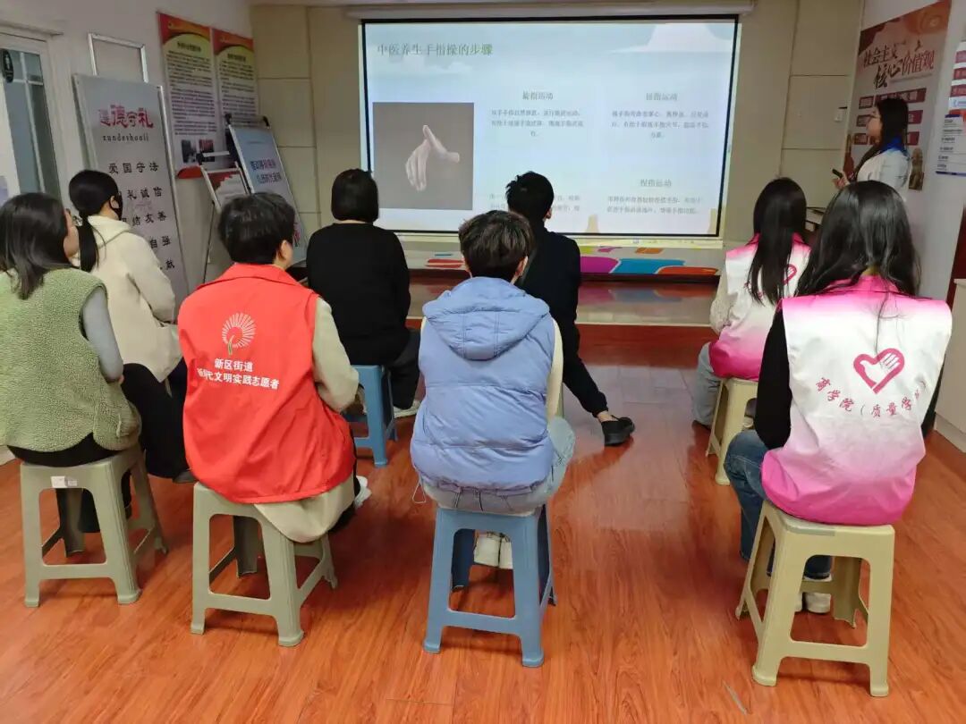 在环保手工制作的间隙,志愿者结合生活中的实际案例,用通俗易懂的语言向社区居民介绍了环保的重要性,并分享了春季养生操对健康的积极作用,倡导居民定期锻炼,伴随着欢快的节奏,志愿者和居民们一起舒展身体,整齐地做着养生操。大家脸上洋溢着灿烂的笑容,动作充满活力。
