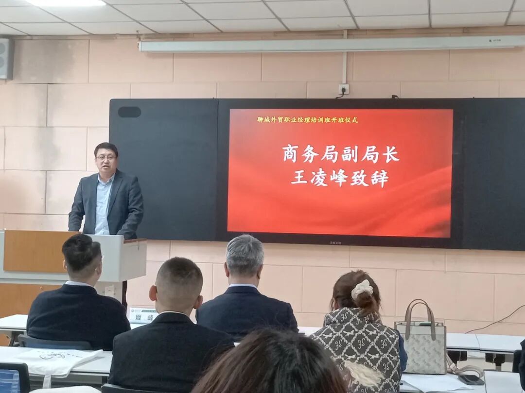 聊城市商务局副局长王凌峰、中国商务部国际贸易经济合作研究院学术委员会张建平教授、聊城大学商学院教师刘允岩、马霞、上海特易信息科技有限公司姬峰、区域经理穆小丹以及参加培训的18位企业代表们参加本次课程。