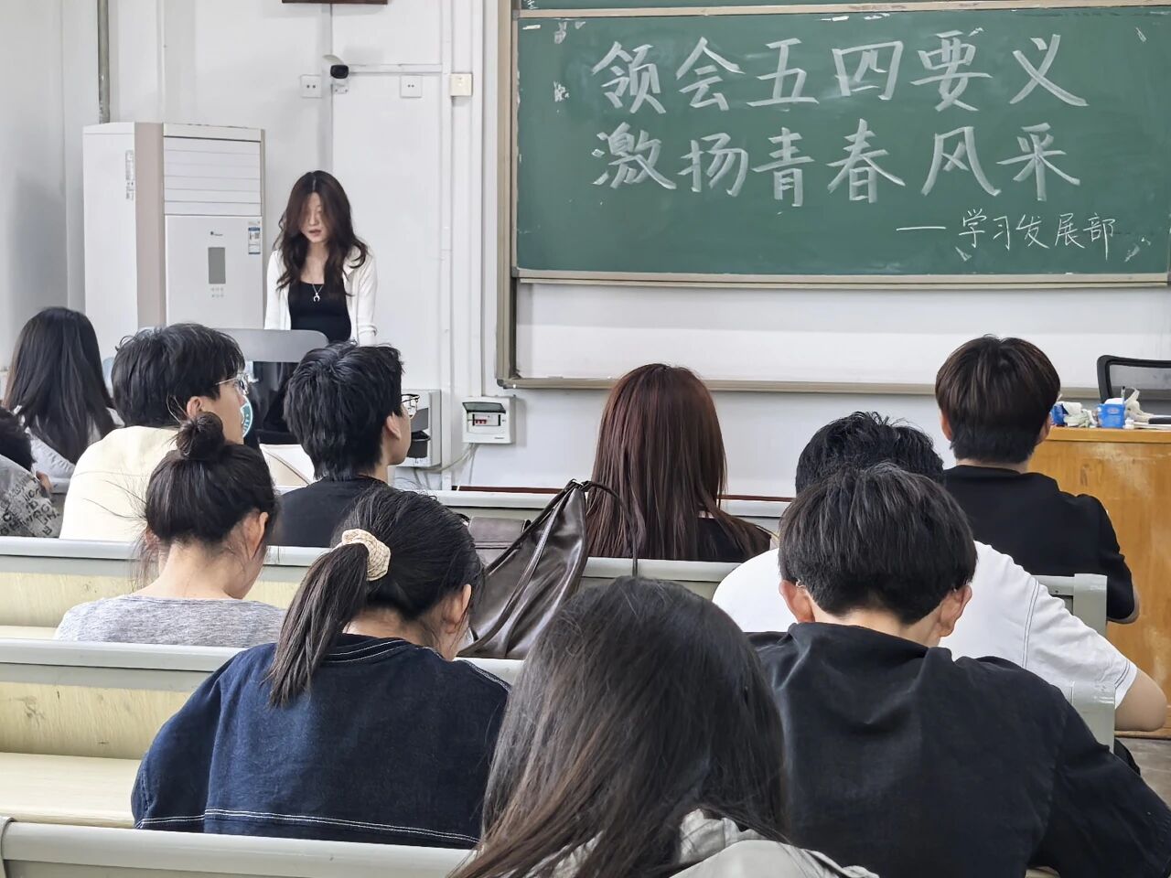 为纪念五四运动106周年,引导青年团员深入学习五四精神,4月26日,商学院(质量学院)于东校区1#302举办“领会五四要义 领养青春风采”主题团日活动,2024级会计学8班徐欣彤担任讲解员,2022、2023、2024级各班班团参加活动。