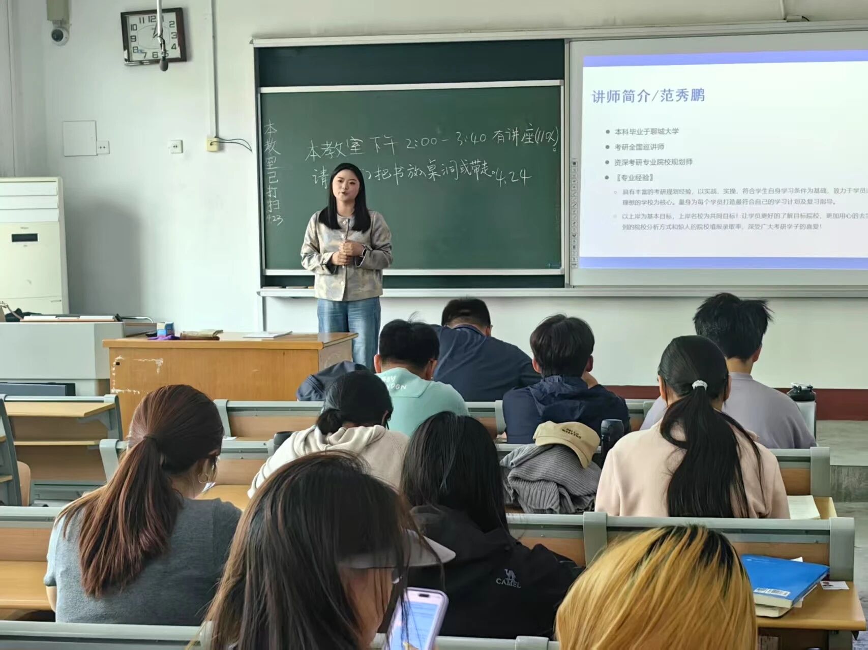 范秀鹏从考研形势分析入手,在深度剖析当前考研大环境的基础上,结合实际案例,围绕考研政策动态、院校专业选择策略以及备考规划等重点问题,对同学们普遍关注的“如何平衡学业与实践”“如何提升核心竞争力”等问题提供了专业解析与建议,有效帮助学院学子明确了自身定位。同时,范秀鹏详细讲解了如何综合个人兴趣、专业前景、院校实力等因素进行考研选择与择校考量,并针对同学们的现场提问作了详细解答。