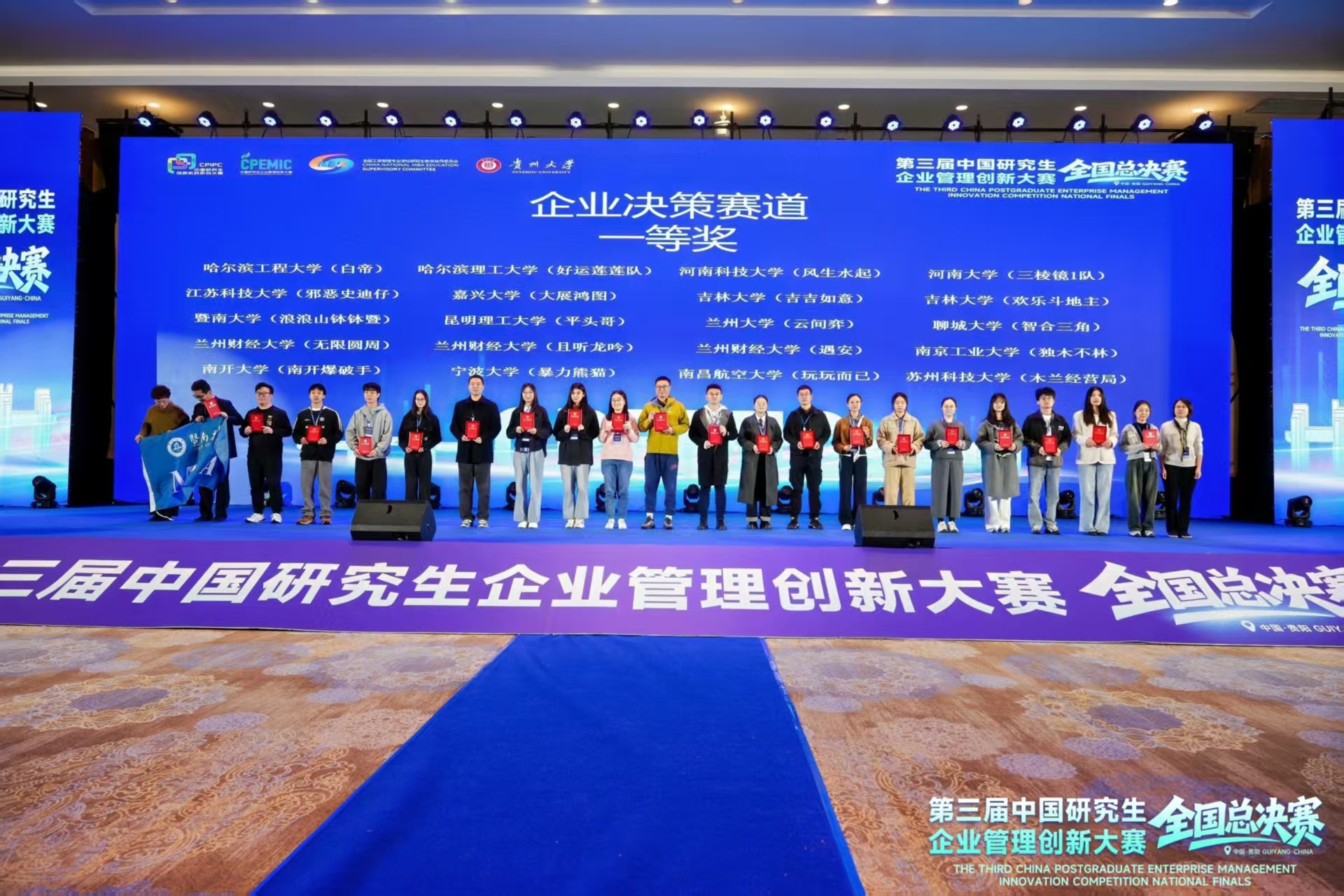 11月7日至9日,第三届中国研究生企业管理创新大赛全国总决赛在贵阳举行,我校商学院MBA教育中心组建的“智合三角队”(杨睿、韩亚筱、林琳)和“M&W队”(王继文、岳亚敏、马金萌)在学院副教授焦艳芳的指导下,在企业决策赛道脱颖而出,分别荣获国家一等奖和国家三等奖,实现了我校在该赛事上国家一等奖的突破。