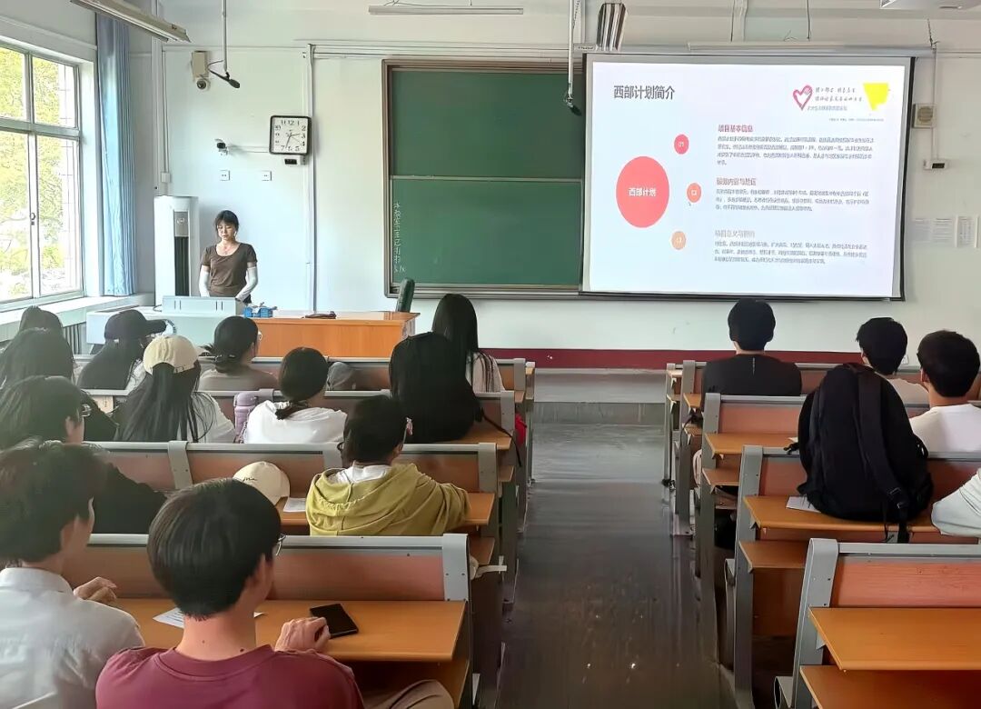 宣讲会在展现西部壮美图景的纪录片中拉开帷幕,镜头展现志愿者扎根偏远山区教育帮扶、助力边疆产业振兴的生动场景,同学们深刻感受到西部计划的重要意义与时代价值。刘亦雯紧扣总书记回信精神的核心内容,以谢依特小学志愿者团队扎根海拔3200米高原支教点、自制138件教具、开发9门藏汉双语课程的感人事迹为切入点,结合支教团队“帐篷教室”“马背课堂”等创新实践,深入阐释“把小我融入大我”的精神内涵,鼓励同学们从身边小事做起,将回信精神融入日常生活,积极参与志愿服务,共同营造互助友爱的氛围。在此基础上,刘亦雯围绕西部计划的国家战略定位、服务内容、选拔标准等核心内容进行了系统讲解,深入解读了同学们关心的生活补贴、考研加分、公务员招录等优惠政策和西部计划的保障机制。