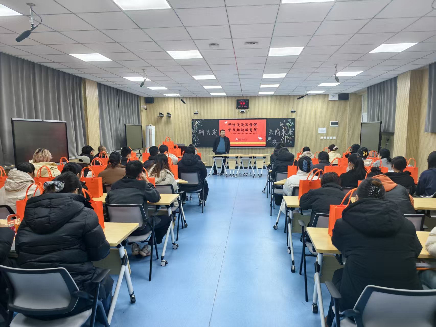 随后施安琪组织为每一位备考学子递上精心准备的考研大礼包。礼包上印有“一战成硕,一研为定”的励志标语,内含考研文具套装、心想事“橙”的清甜橙子、考研“旺旺”的旺仔小零食、丝滑治愈的德芙巧克力、暖身暖心的暖宝宝、提神续航的咖啡,还有奔赴考场的登机牌与精心准备的祝福卡片。每一份物品都寄托着学院对考研学子的深切关怀与殷切期盼。