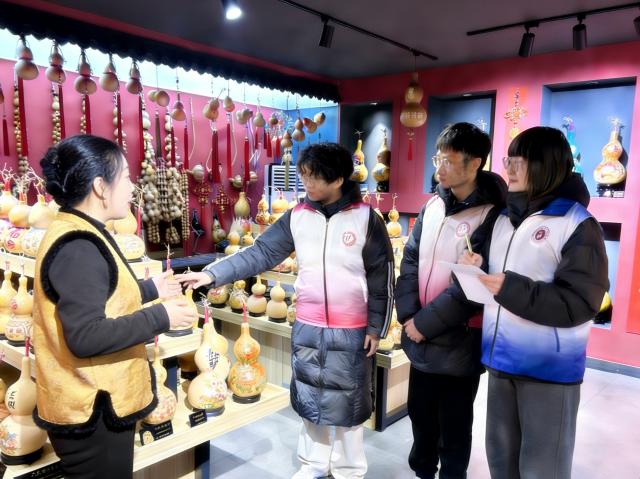 活动现场,实践队员近距离观摩葫芦雕刻、烙画等非遗技艺的完整制作流程,聆听店主讲述葫芦手工艺品从设计、制作到销售的全链条发展故事,沉浸式感受非遗技艺的匠心与魅力。在此基础上,队员们主动化身非遗宣传员,向到店游客细致讲解葫芦作品的文化寓意、工艺特色与创作巧思,助力店主推广非遗文创产品,让更多人认识并了解聊城葫芦文化的独特价值。同时,实践队员用镜头全方位记录技艺展示、产品讲解的生动场景,为后续非遗文化宣传推广收集了丰富且珍贵的素材。