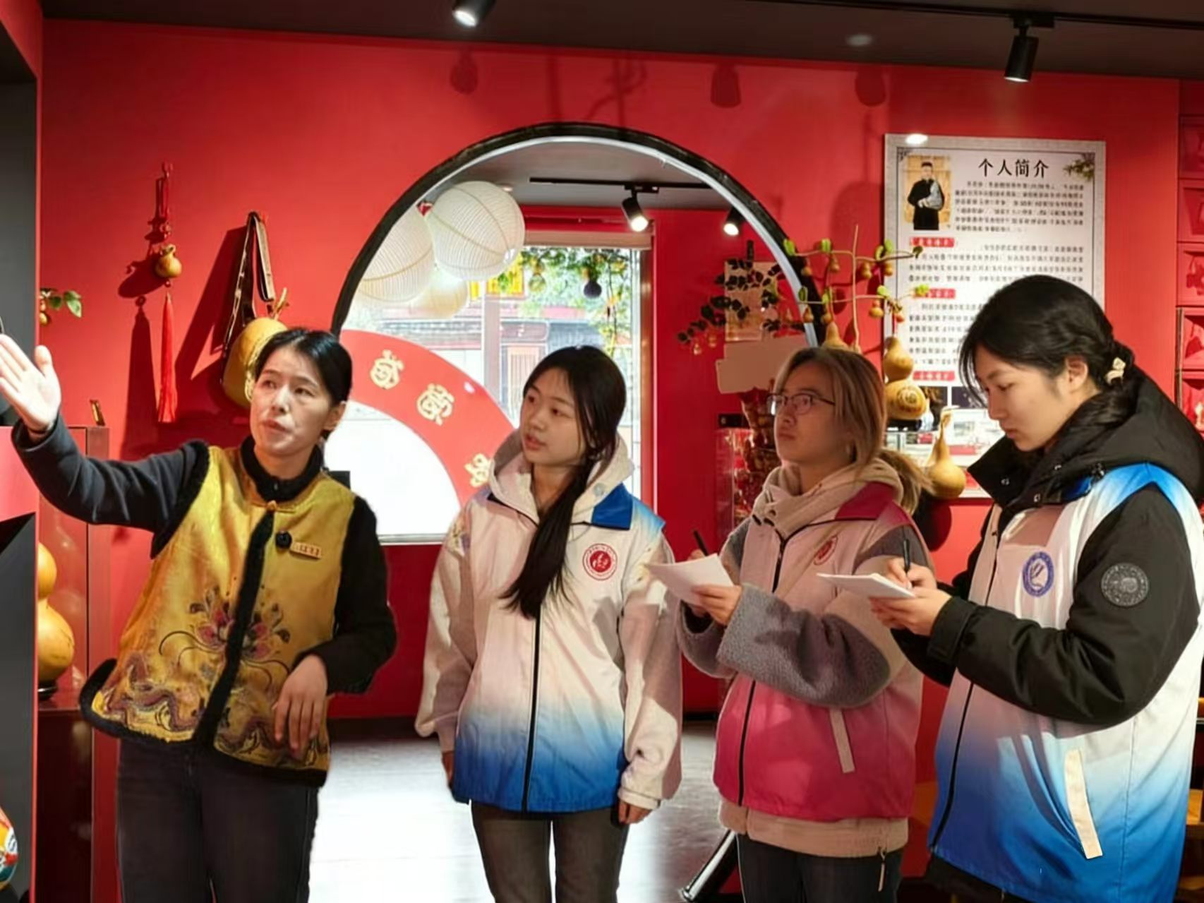 在专业讲解员的带领下,志愿者们走进古城葫芦雕刻非遗展厅,系统参观了从明清范制葫芦到当代创新作品的百余件展品,并在讲解员的细致讲解下,结合实物详细了解了葫芦雕刻“福禄双全”“多子多福”的吉祥寓意,及其作为运河沿岸特色非遗,在民俗与工艺传承中的发展脉络,直观感受了传统工艺的文化厚度。在此基础上,志愿者在古城街头设置流动宣传点,向过往游客与当地居民分享参观所学,通过成品展示、故事讲述、互动问答等形式,普及葫芦雕刻的历史渊源与文化价值。